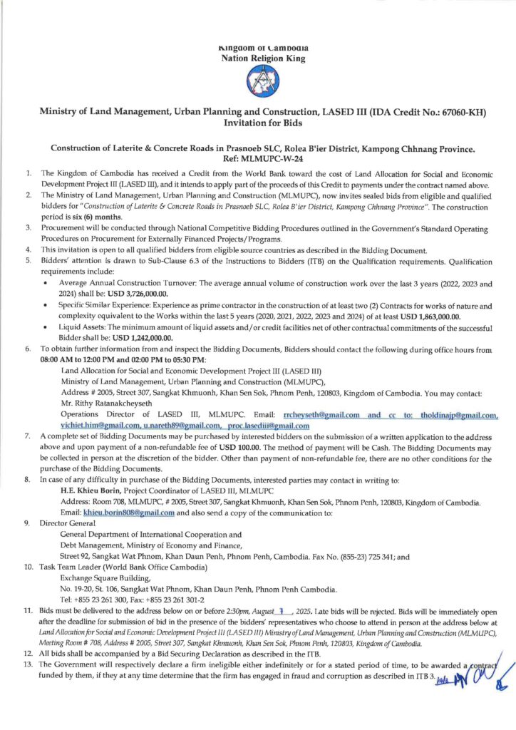 Notice on bidding for the construction of red gravel roads and concrete roads for the social land concession site, Prasnup commune, Rola Prai district, Kampong Chhnang province