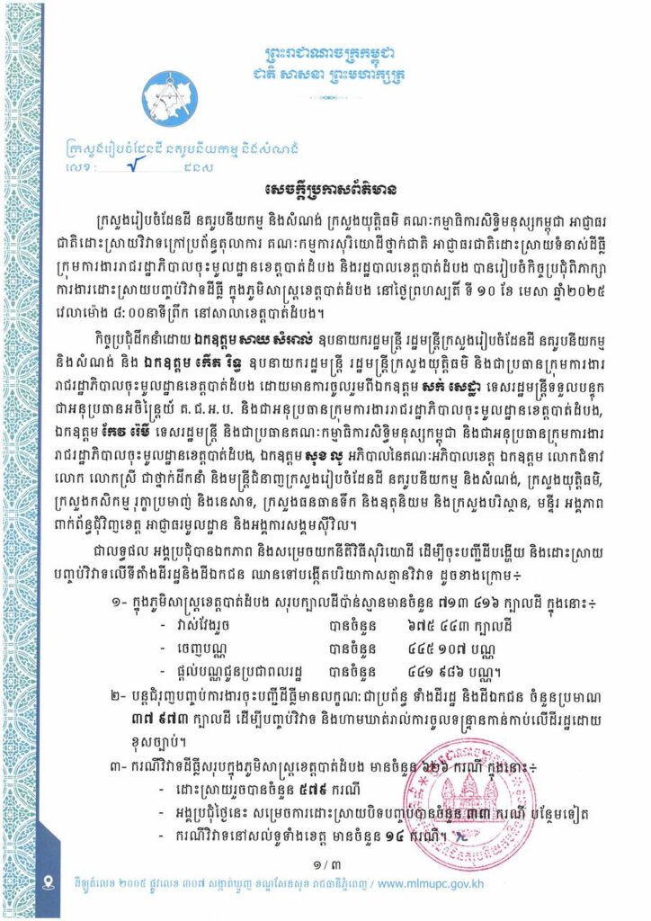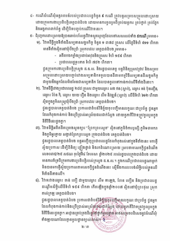 The Ministry of Land Management, Urban Planning and Construction, the Ministry of Justice, the Cambodian Human Rights Committee, the National Authority for Extrajudicial Dispute Resolution, the National Cadastral Commission, the National Authority for Land Dispute Resolution, the Royal Government Working Group at the Battambang Provincial Level, and the Battambang Provincial Administration have agreed to coordinate and resolve disputes in Battambang Province through all mechanisms, all levels, all departments, and all relevant parties. In the case of citizens who do not have real land, they must submit an application to the Provincial Social Land Concession Committee.