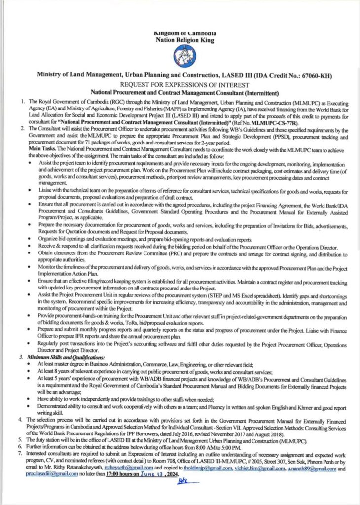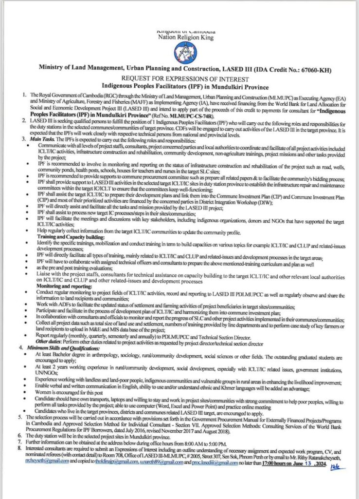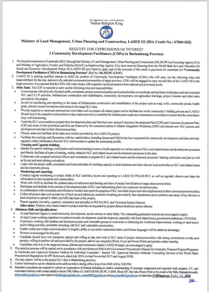 Announcement regarding the selection of Procurement Consultant (part-time), Community Development Coordinator in Battambang Province and Ethnic Minority Coordinator in Mondulkiri and Ratanakiri Provinces.
