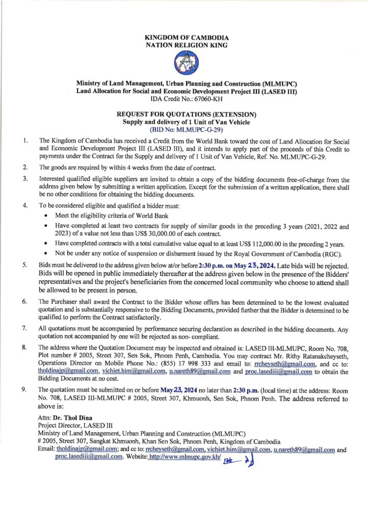 Notice regarding the extension of the deadline for the consultation on the supply of 1 small tourist car