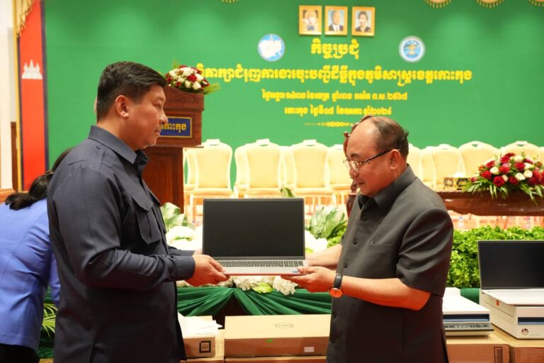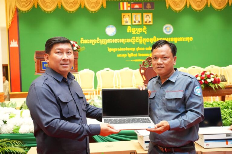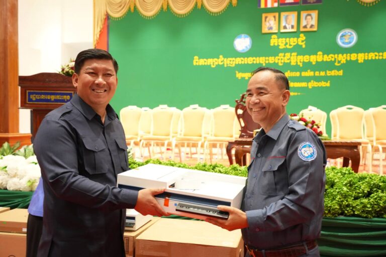 To continue promoting land registration work, HE Say Sam Al handed over equipment to the Koh Kong Department of Land Management, Urban Planning, Construction and Cadastre, including: 4 desktop computers and 7 laptops, along with equipment and 6 scanners.