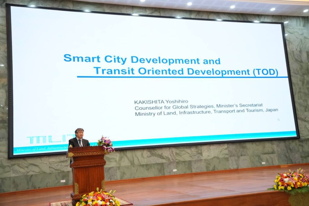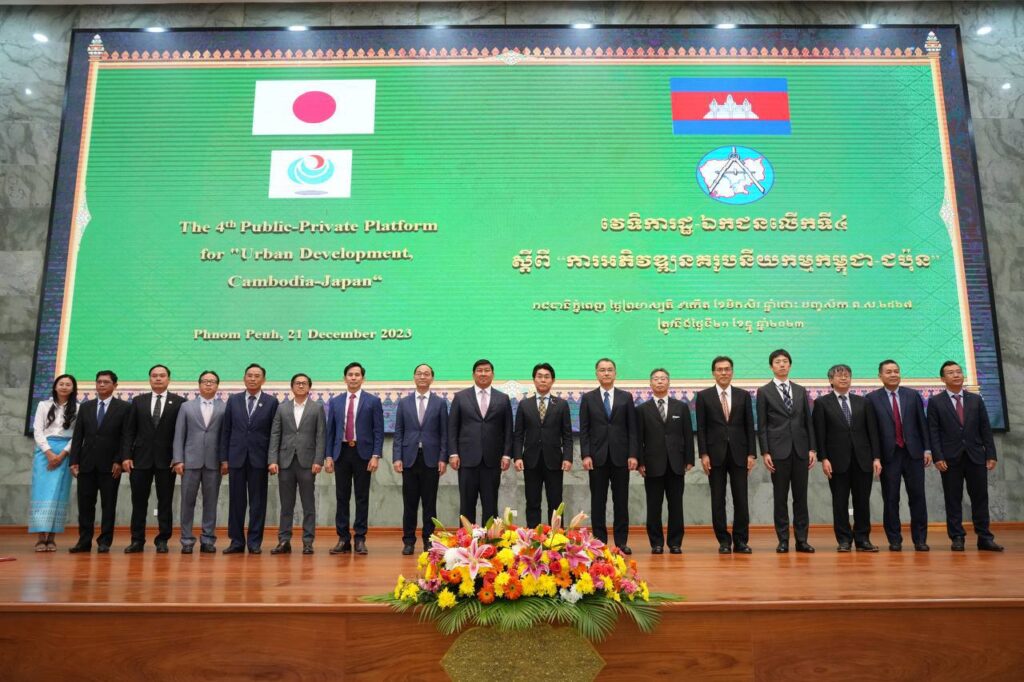HE spoke at the 4th Public-Private Forum on Cambodia-Japan Urban Development, which was organized at the Ministry’s headquarters on December 21, 2023. The forum was attended by leaders of the Ministry of Land Management, Urban Planning and Construction of Cambodia and the Ministry of Land, Infrastructure, Transport and Tourism of Japan, as well as the Cambodian Chamber of Commerce, the Cambodian Builders Association, the Cambodian Housing Developers Association, the Cambodian Real Estate Appraisers Association, and Cambodian investment companies and businessmen.