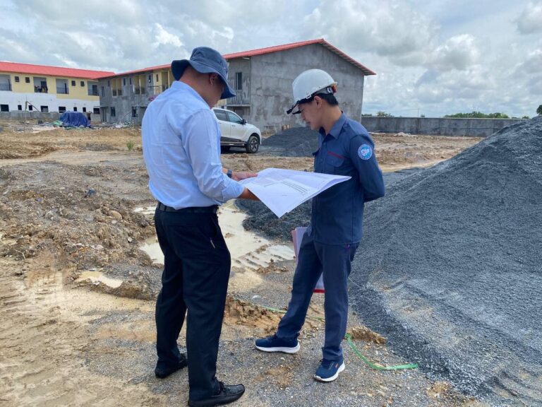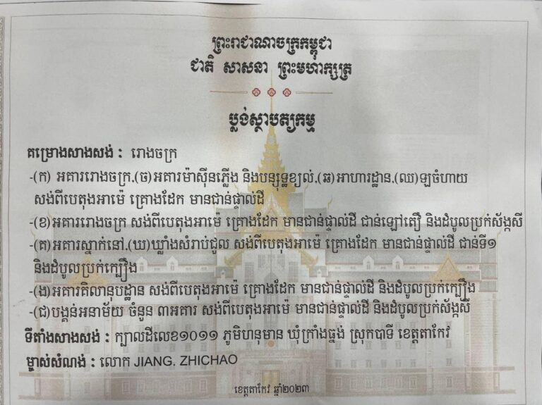 The Construction Department of the General Department of Construction inspected the construction site of Mr. JIANG ZHICHAO's factory building located at land plot number 1011, Hanumean village, Kraing Thanong commune, Bati district, Takeo province, according to the request to open the site by the owner of the construction, which has a construction permit number 346 DNS/ASN dated August 18, 2023.
